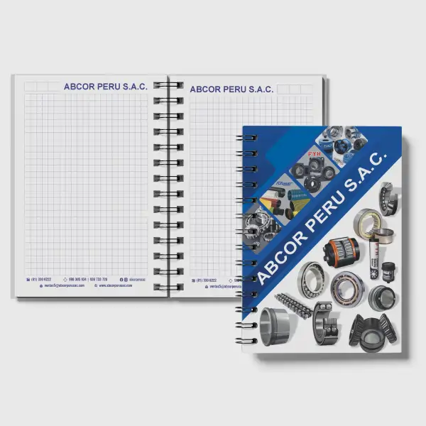 Fabricamos una cubierta de cartón prensado y la forramos completamente con Papel Couché impreso a full color y plastificado (Mate o Brillante). Esta tapa dura asegura que la libreta no se maltrate jamás.