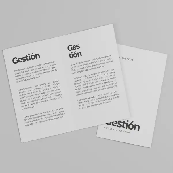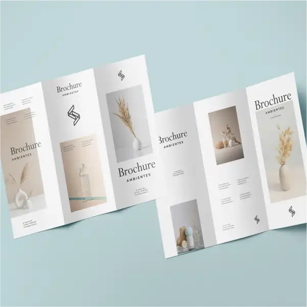 El estándar del mercado es utilizar una hoja tamaño A4 (29.7 x 21 cm) de forma horizontal e imprimirla a full color para luego realizar los dobleces. Si necesitas algo mucho más impactante, podemos trabajar partiendo de un tamaño A3 (42 x 29.7 cm), lo que resulta en paneles sumamente amplios al cerrarse.