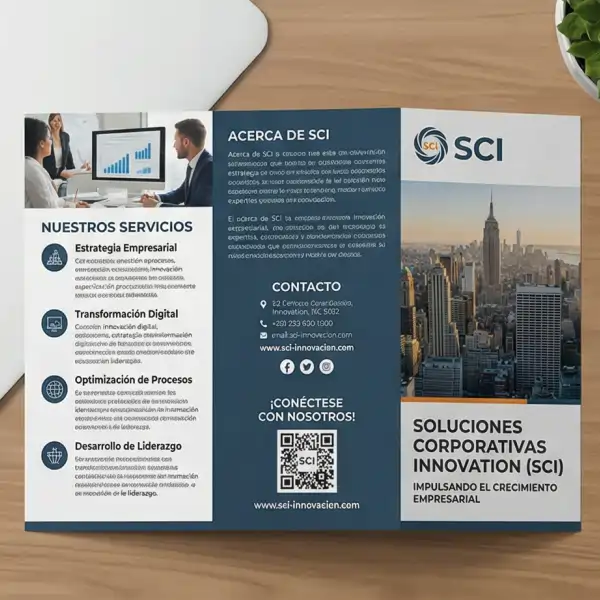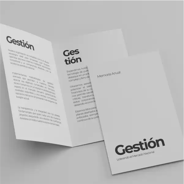 Te permite crear una narrativa. La portada engancha, al abrir la primera solapa explicas el problema, en el interior despliegas tus servicios como solución, y en la contraportada dejas el contacto. Es el formato número uno para la presentación corporativa B2B.
