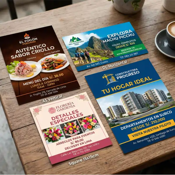 El tamaño clásico (1/4 de página). Es económico, entra en el bolsillo del cliente y es perfecto para ofertas puntuales.