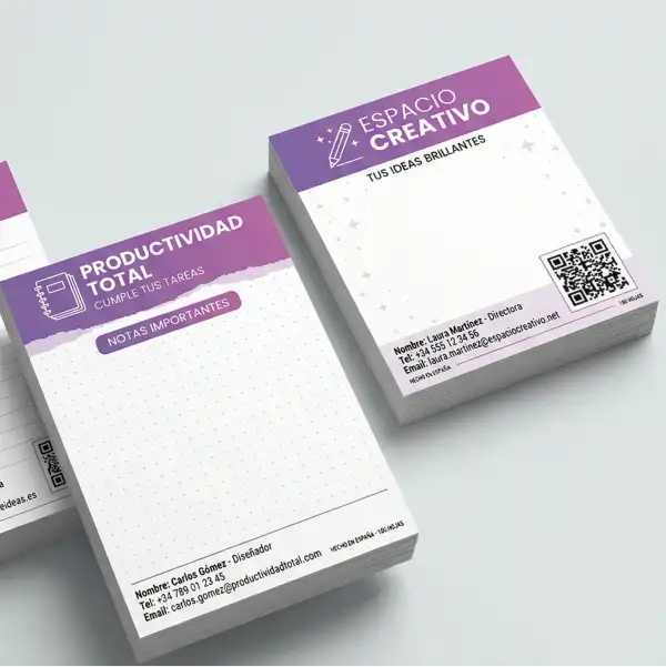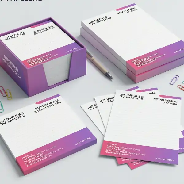 En Imprenta PyM, fabricamos cubos de notas y tacos de papel institucionales, diseñados con los formatos clásicos y el material exacto para garantizar una experiencia de escritura perfecta. Es el merchandising B2B más inteligente para fidelizar a tus compradores, y con nuestras opciones digitales adicionales, puede convertirse en una fuente constante de tráfico hacia tu negocio.